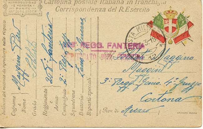 Cartolina in franchigia spedita il 7.5.1918, diretta a Rigutino. Nel periodo il reggimento è in zona di riposo in Val Rovina. La P.M. 100 è a Solagna (Vicenza)