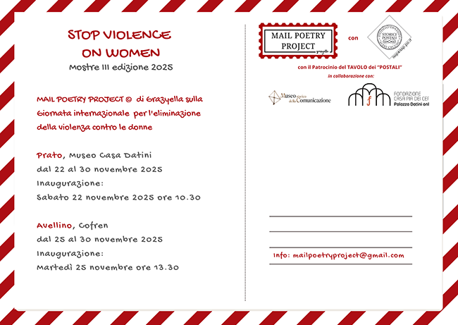 Siamo giunti alla terza edizione del progetto internazionale Stop Violence on Women, ideato e curato da Grazyella (Graziella Di Grezia) in collaborazione con Graziella Rivitti, il Museo Storico della Comunicazione di Roma, il Tavolo dei Postali coordinato da Fabio Bonacina.