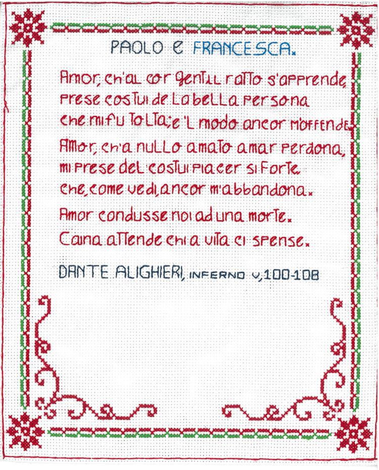 E’ questo il caso delle due delicate e suggestive immagini dipinte da Marcello raffigurate sui Buon Natale postali vaticani del 2018, con valori rispettivamente 1,10 e 1,15 euro. Nell’arte del ricamo applicato alla filatelia si fanno attualmente apprezzare i lavori di Antonio che con tela, ago e filo trasforma poesie in vere e proprie opere d’arte tessute. Come “Farfalle libere” di Alda Merini, realizzato a punto croce esterno, punto scritto interno usando ago, filo e cotone Dmc su tela Aida 55 punti con l’aggiunta, ai quattro lati, di altrettanti francobolli italiani del 1996 raffiguranti farfalle. Venti le ore impiegate per portare a termine questo piccolo gioiello da 30 x 26 centimetri.