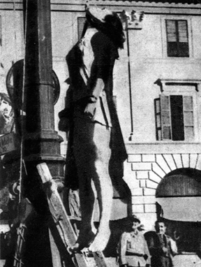 Il corpo di Iris Versari appeso a un lampione di Piazza Saffi a Forlì. Iris Versari sarà una delle 19 donne della Resistenza decorate con medaglia d'oro: peccato si sia dovuto attendere il 1976 per vedergliela assegnata. Lorenzo Oliveri