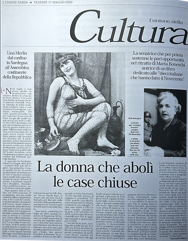 L'Unione Sarda del 17 maggio 2002 Da L’Unione Sarda 17 maggio 2002 ”La donna che abolì le case chiuse” Il boom è nel 1891 quando in Italia funzionano 10439 bordelli… Nel 1949 quando Lina Merlin UNICA DONNA eletta in Senato, le case sono ridotte a 750. Quando il 20 settembre 1958 si arriva alla CHIUSURA i bordelli sono 504. LINA MERLIN HA VINTO QUELLA CHE PER LEI È SOLO UNA FORMA DI SCHIAVITU’. Ogni anno qualcuno prova di nuovo a riaprire le Case (per pudore le chiama magari Eros Center), ma dal 1958 ad oggi la battaglia di Lina Merlin è stata VINCENTE!!” Giancarlo Ghirra NOTA: |