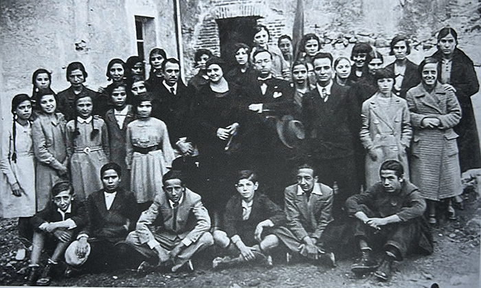 Lina Merlin con il confinato Antonino Campanozzi e un gruppo di allieve ad Orune