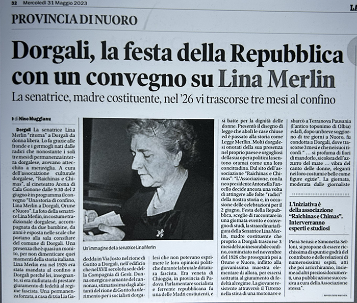 Il Postalista è lieto di annunciare che, in occasione di questo 8 MARZO 2026, amplia la cerchia delle sue AMICIZIE incontrando le Persone che a Dorgali (Nuoro), hanno creato una Associazione Culturale sacrandola con nome Raichinas e Chimas ed a noi, hanno inviato un ampio estratto di “LINA MERLIN – Una storia di confino – pubblicazione da loro direttamente curata ed edita da Carlo Delfino editore (*). Il Postalista pubblica con piacere quanto ricevuto condividendo medesimi intendimenti.