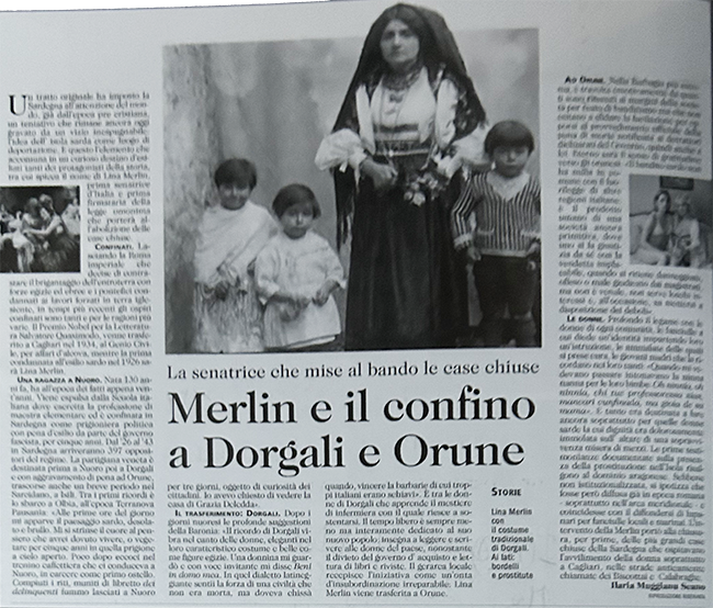 4. Soggiorno a Dorgali 17 dicembre 1926 - 21 marzo 1927 Lina Merlin scopre la Sardegna dopo un umiliante, faticoso trasferimento "di prigione in prigione", "di cellulare in cellulare", accomunata a una lunga fila di 54 ergastolani e dopo l'attraversamento del Tirreno sulla "stiva di una motonave" dove l'unica consolazione è il gesto pietoso del maresciallo dei carabinieri che le offre il suo mantello per ripararsi dal freddo e la presenta come sua sorella per proteggerla dalla curiosità dei colleghi. Il fascismo ha steso i suoi rami anche in Sardegna: Podestà e Prefetti hanno cancellato le forme della autonomia politica liberale. Il confronto politico tace sotto il controllo puntuale e violento delle autorità fasciste che lo attuano su tutti ma in modo particolare sui confinati. Lina Merlin lo subisce, senza mai cedere, neppure nei momenti di maggior sconforto, custodendo viva la sua libertà di pensiero e la sua forza di resistente. Da un lato lotta per difendere i suoi diritti, dall'altro, non cede in nessun modo al vittimismo, volge la sua attenzione alle persone fra le quali è finita. Il suo è uno sguardo carico di curiosità di donna colta, di interesse vivo e partecipe alla condizione sociale del popolo, in particolare delle donne. Ne nasce un incontro vivo e profondo che è scoperta, scambio di affetti, crescita reciproca. Lei impara ad amare la bellezza del piccolo paese di Dorgali, il suo respiro fra i monti e il mare, la familiarità di una lingua sconosciuta di cui intravvede subito le radici latine, il calore di quelle donne, schiacciate dal peso della povertà, che offrono ciò che hanno, per alleggerire la condizione di quella straniera, additata come nemica e cosi familiare nei gesti, nei sorrisi, nella disponibilità a offrire consigli, ad insegnare i rudimenti per superare un analfabetismo generale e diffuso. Lo scambio avviene nella dimensione del fare, delle opere delle donne, del capire. Una relazione forte che rimarrà nel tempo, e di cui abbiamo intense, commoventi testimonianze nelle lettere scambiate tra Lina Merlin e Maria Farris o nelle testimonianze di Zizza De Serra di Dorgali (centenaria che ancora custodisce con cura e precisione la memoria di questa giovane signora Angelina che ha trovato accoglienza e affetto nella casa della suocera Lia Sale Mulas che la Merlin chiamerà "la mia Mammina sarda". A testimoniare la fiducia reciproca la fotografia della Merlin che indossa il costume di Dorgali, con affianco i nipotini dei signori che l'hanno ospitata nella loro casa. Lina accetta di indossare l'abito tradizionale delle donne di Dorgali, è quello delle feste, sontuoso, ricco di gioielli e di bellissimi ricami fatti a mano, l’oggetto più prezioso delle mani delle donne. Le donne la riconoscono come una di loro, ne rispettano la superiorità culturale, nel rivolgerle domande intime, segrete, percepiscono che, provenendo da città lontane ed evolute, conosce la vita, e può dare preziosi consigli. Ricambiano con la fiducia, l'affetto, il dono di un ricamo diverso, della tradizione che lei non conosce. Da Dorgali viene trasferita a Orune, dal 23 marzo 1927 al 17 luglio 1927, e infine a Nuoro dal luglio 1927 al novembre 1929. Si confermano, attraverso le testimonianze, le modalità già ricordate: il ricordo positivo, in chi la conobbe, di essere donna elegante e intelligente che mette a disposizione delle persone che la accolgono le sue competenze di maestra, educatrice, insegna ai bambini, prepara per il concorso magistrale alcune giovani donne che studiavano per diventare maestre.