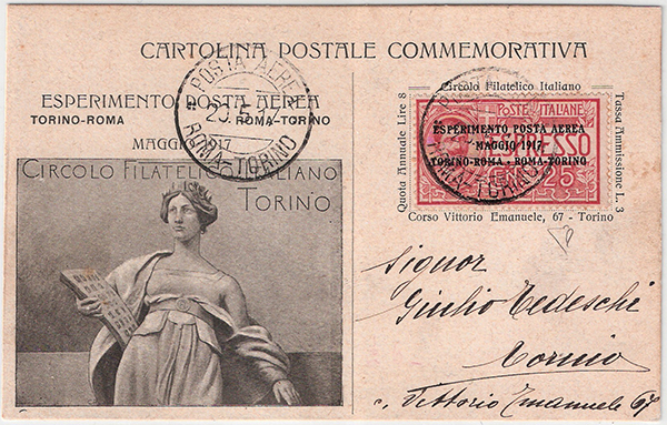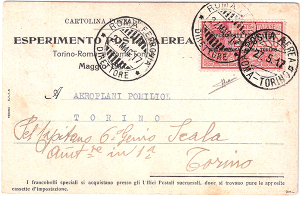 La comune cartolina verde utilizzata nel volo di andata venne fatta pervenire, nuova, in pochissimi esemplari al corrispondete romano del Circolo che, cancellato manualmente l’indirizzo prestampato e sostituitolo con quello della sede torinese del Circolo, la rispedì col volo Roma – Torino di cui reca l’annullo datato 27 maggio, tipo 1°. Ne sono attualmente note poche unità.