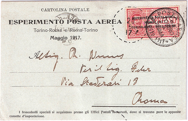 Una variante interessante e molto più rara, soprattutto se timbrata in arrivo a Roma, è costituita da questa stessa cartolina ma con il solo timbro in gomma “POSTA AEREA / DA / TORINO / A / ROMA / MAGGIO 1917” impresso in colore azzurro.