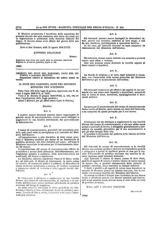 Benito Mussolini: Disposizioni relative al trattamento dei sudditi nemici internati:
