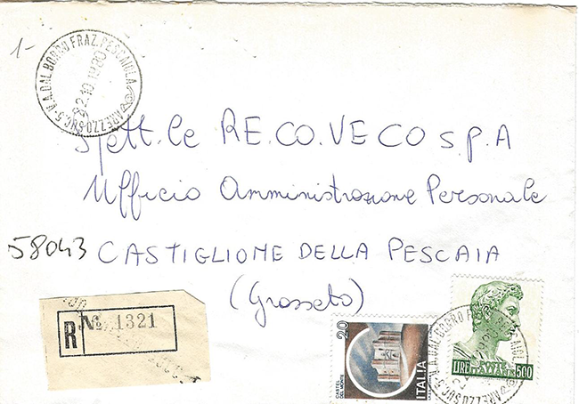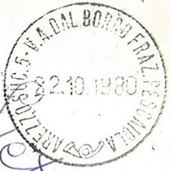 Curioso è questo suo primo bollo che cita nella corona: AREZZO SUC. 5 - V.A.DAL BORRO FRAZ. PESCAIOLA con a seguire il "corno" - occorre notare che Pescaiola non era una frazione, ma una zona della città.
