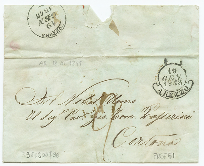 | 9 - È il primo doppio cerchio di Arezzo con datario, è stato impresso sempre in nero e normalmente utilizzato in arrivo al verso della busta, si conosce utilizzato dal 1842 al 1851 |