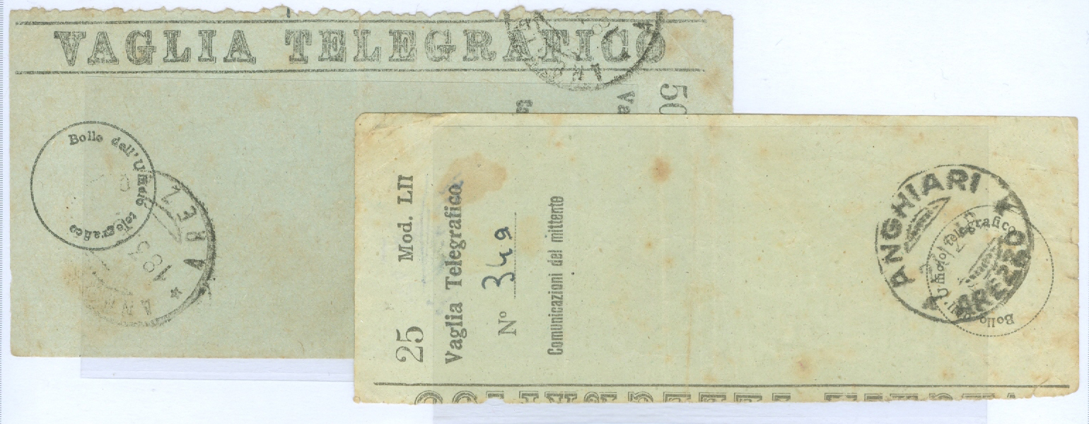 Telegraphic money order receipt to internee to camp of Anghiari - Renicci, from 18.3.43, and 27.12.42. (Collezione Veselko Guštin)