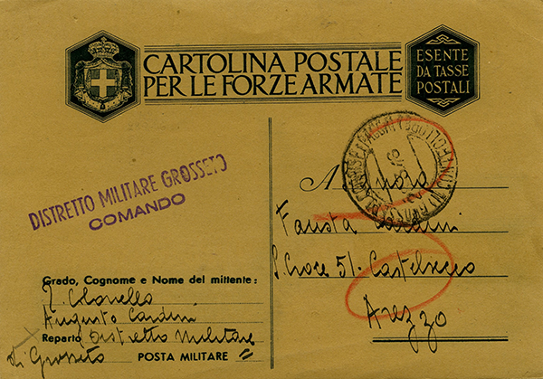 Pieve al Bagnoro ed Arezzo erano state liberate il 16 luglio, la presenza del timbro A.C.S. di Arezzo dimostra che la lettera è pervenuta nella mani del destinatario dopo oltre un mese, sia per le difficoltà delle comunicazioni di quel momento,