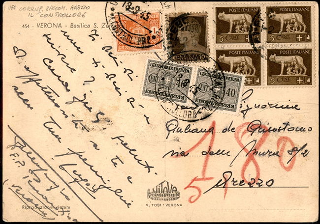 Cartolina illustrata diretta ad Arezzo, tassata in arrivo con segnatasse per £. 1,80, per il doppio del porto mancante, annullata 18.9.1945, bollo dell'Ufficio corrisp. raccom. Arezzo - Il Controllare