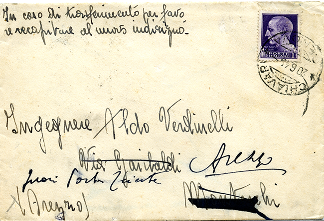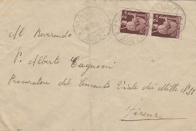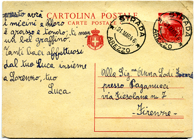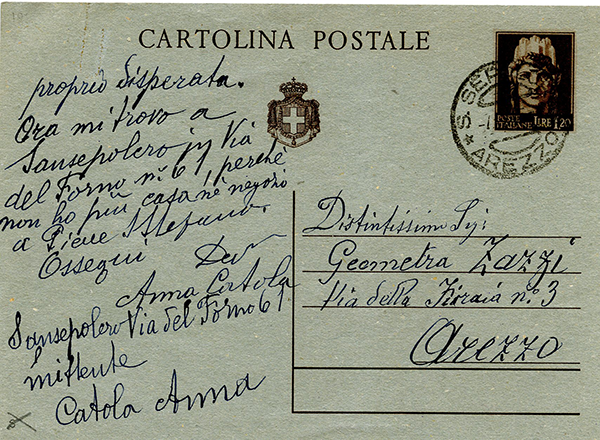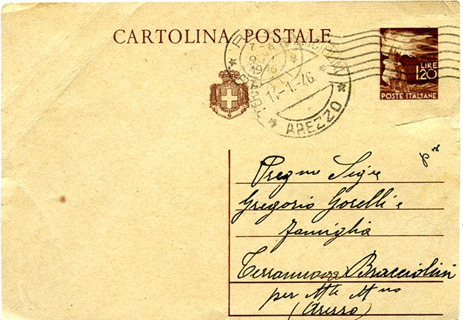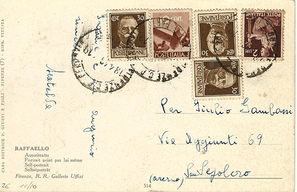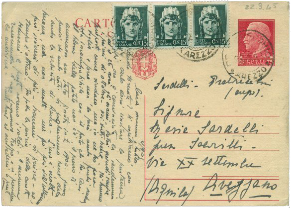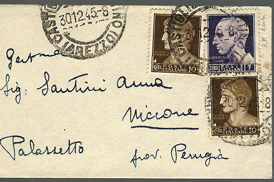 Fabio Petrini: Sansepolcro 7-12-1945 - Avviso di ricevimento da Anghiari 19-4-1946 - da Arezzo Ferrovia 9.6.1944 (RSI) in arrivo a Badia Tedalda il 24.1.945 - da San Giuseppe Vesuviano 9.4.1945 a Cortona - Chiavari (GE) 20.6.1945 a Monterchi (AR) 26.6.1945 poi ad Arezzo 28.6.1945 - da Strada a Firenze del 31.3.1945 - da Roma 9.1.1946 a Terranova Bracciolini (AR) arrivo 14.1.1946
