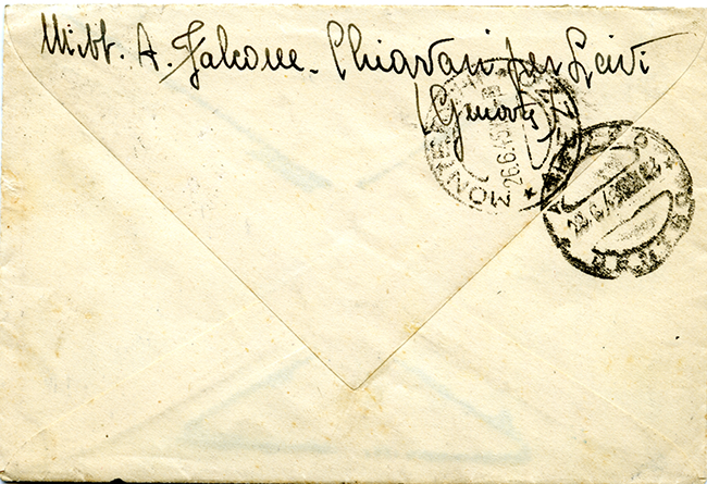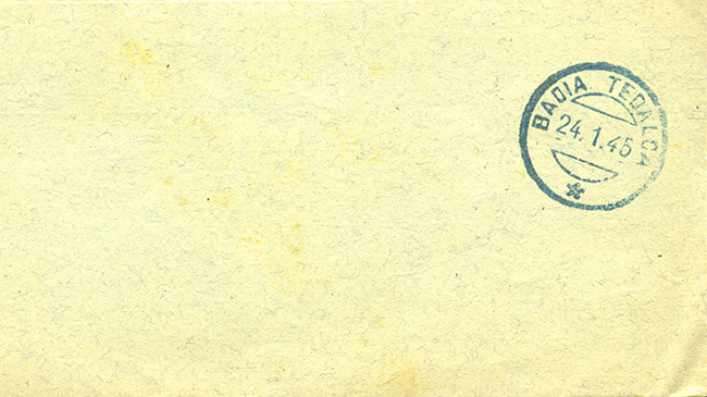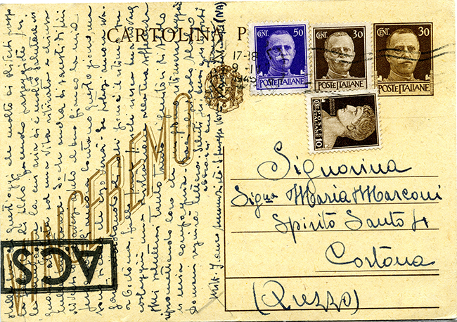 La lettera è accompagnata dal bollo di censura delle forze alleate cosiddetto "a ponte", con il numero 8358, assegnato all'ufficio di censura aretino.