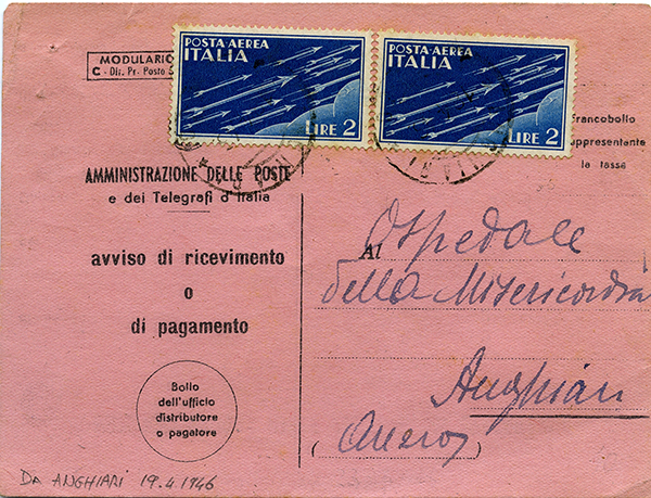 Avviso di Ricevimento da Anghiari (AR) 19.4.1946 per Bolzano, affrancata per £.4 (A/R) con 2 francobolli £.2 Posta Aerea Imperiale (Frecce) usati in emergenza - (Collezione Fabio Petrini)