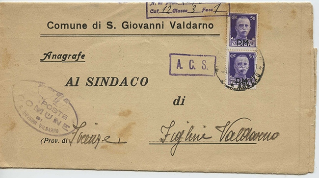 6 aprile 1945 - S. Giovanni Valdarno a Figliene Valdarno (Fi), affrancata per L. 1 (corrispondenza tra sindaci), con 2 francobolli da £ 0,50 soprastampati P.M.