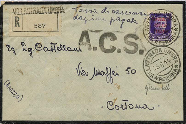 Straordinaria e Rara in Umbria l'integrazione in contanti per il porto di raccomandazione, (causa carenza francobolli). Bollo lineare ACS del servizio di censura alleato, identificata e non censurata la lettera venne bloccata causa eventi bellici, gli Alleati arrivarono il 24.6.1944, bollo di arrivo a Cortona 31.12.1944 (Cortona dista 30 km. da Perugia) - (Collezione Fabio Petrini)