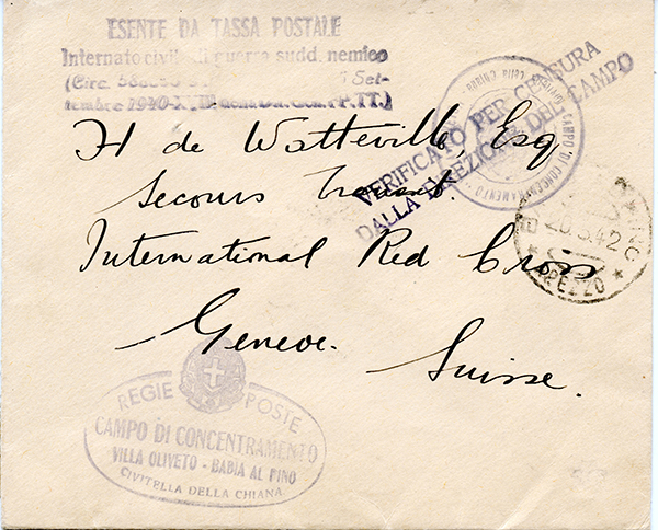 Recentemente ho avuto l’opportunità di poter acquistare, venduta negli Stati Uniti, una busta spedita dal campo di prigionia di Villa Oliveto e diretta a Ginevra alla sede della Croce Rossa Internazionale. La busta riporta quasi tutti i timbri conosciuti, anzi ne aggiunge persino uno a quelli che già mi aveva fatto conoscere Luciano Previato: