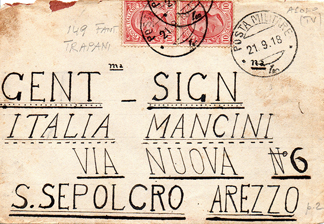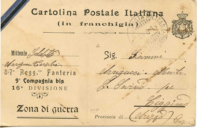 La corrispondenza dovrebbe essere stata postalizzata attraverso la PM 82, secondo Marchese è possibile che, pur non menzionata, si tratti di una dipendenza tattica o dell’intera Brigata oppure del solo 156° Reggimento.