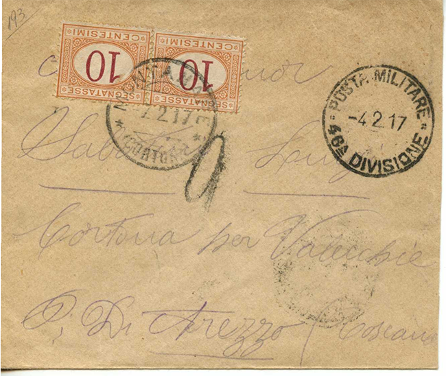 | Busta non affrancata postalizzata in 4.2.1917, tassata per 20 cent. a Montanare di Cortona il 7.2.1917, senza penali, per il solo costo della lettera per l'interno. La brigata è inquadrata nella 46ª Divisione, in zona di guerra dal 18 gennaio al 21 agosto nel settore Mrzli - destra Zleme (quote 1186-800-860). |