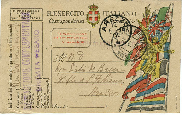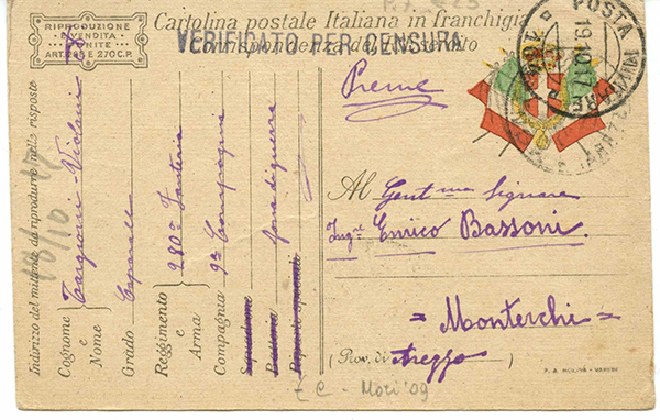 | Cartolina illustrata del 6 febbraio 1918, alla data chi scrive non è al fronte con la Divisione, ma dipendente dall'Intendenza della II Armata, terminata la raccolta di uomini e dopo un minimo di addestramento, raggiungeranno il reggimento - La cartolina è postalizzata attraverso l'Ufficio di P.M. 55.A |