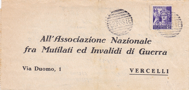 Dalla Sezione Provinciale di Vercelli dell'Ass. Mutilati ed Invalidi di Guerra all'Associazione Nazionale fra Mutilati ed Invalidi di Guerra il 20.06.1945. Le impronte del bollo RR.POSTE analizzate: