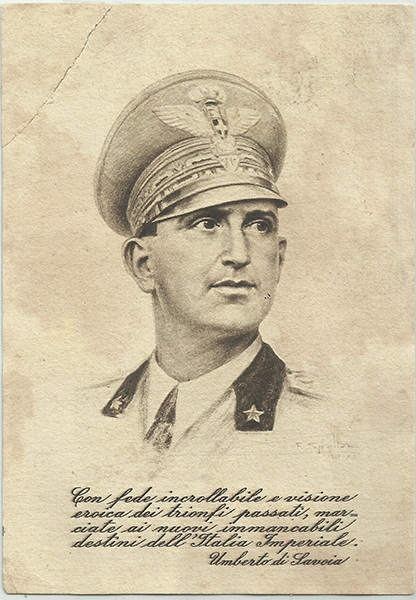 PERCORSO: Le schede > Posta Militare > Lettere dal fronte e dalla prigionia > questa pagina Un epistolario di una quarantina di cartoline in franchigia ci dà la possibilità di ripercorrere le tappe della campagna di Tunisia. Dopo altre campagne di guerra in Albania e nei Balcani, era stato spedito in Sicilia in attesa di un imbarco per l’Africa Settentrionale. Le sue corrispondenze coprono tutto l’arco temporale dell’ultima parte di guerra in A.S. fermandosi con la fine di aprile 1943. Oltre tale data non abbiamo altre corrispondenze, ma non essendo tra i caduti, si presuppone prigioniero in mano alleata alla fine delle ostilità in territorio tunisino. Le cartoline in franchigia sono scritte in parte a casa, ai familiari a Poppi, in parte alla madre presso parenti a Firenze. Ci parlano di un uomo attaccato alla famiglia, di forti sentimenti religiosi, speranzoso fin da ultimo in una vittoria italiana e ci danno indicazioni preziose anche riguardo ad alcuni reparti militari presenti nel teatro bellico della Tunisia. La prima cartolina illustrata da Spoltore, raffigurante il principe Umberto, è postalizzata dalla PM 3550, posta in Sicilia, dove Bordoni è in attesa dell’imbarco che lo condurrà oltremare.