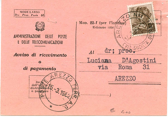 I bolli della DISTRIBUZIONE: AREZZO A.D. e AREZZO FERROVIA A.D. possiamo trovarli sulla posta in arrivo, ma non in quella che ha transitato per AREZZO RECAPITO MECENATE: unica testimonianza postale in mio possesso è il timbro: “SCONOSCIUTO U.P. AREZZO MECENATE” dove l’anno del bollo in partenza da Montevarchi è illeggibile, ma è noto che il periodo d’uso di quel bollo prende avvio dai primi del gennaio 2000.