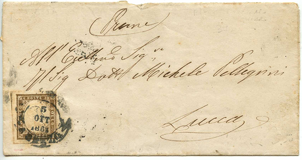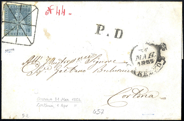 Il 1° aprile1851 è la data di emissione dei francobolli toscani, essendo entrato in vigore il trattato postale firmato con l’Impero Austriaco. Per le lettere dirette all'estero, l'uso dell'affrancatura era obbligatorio, mentre per quelle circolanti all’interno del Granducato rimaneva in essere, facoltativamente, l’antico sistema del pagamento in contanti del porto a volte da parte del mittente più spesso dal destinatario. La tariffa per la spedizione delle corrispondenze all’interno del Granducato rimase valida sino al 30 giugno 1856.