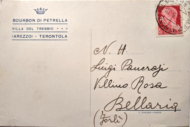 Dalla Villa del Trebbio (Terontola) a Bellaria (Forlì) - affrancato come biglietto da visita.