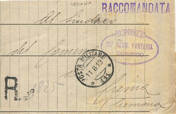 | Piego raccomandato inoltrato attraverso l’ufficio di Posta Militare n. 111 in data 11.8.19. Mittente è il comando dell’85° Reggimento Fanteria. |
