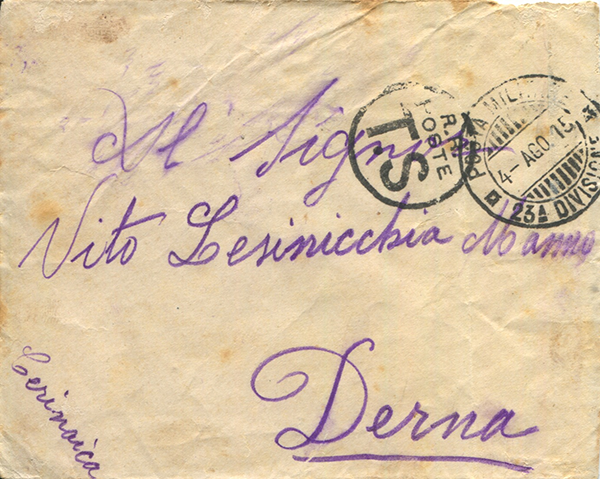 Busta non affrancata inoltrata attraverso l’ufficio di Posta Militare 23^ Divisione in data 4.8.15. Il mittente è un soldato dell’86^ Fanteria. Indirizzata a Derna in Libia. |