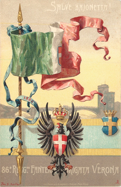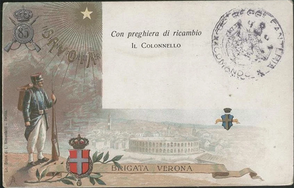 Cartolina illustrata dell'86° Reggimento Fanteria, Brigata Verona, edita nei primi anni del '900 |