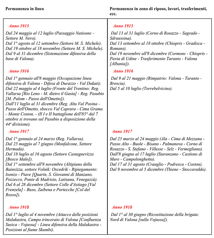 Il 22 maggio la "Verona" entra in linea nel settore di Vallarsa, occupando il tratto di linea Rio Leno - M. Dietro il Gasta. Nei primi giorni sulla fronte da essa presidiata non si svolgono che azioni di artiglieria; il 31 maggio l’85° riceve il cambio e si porta sul Pasubio a presidio della linea Palom q. 2081 - Passo dell'Ometto, mentre l'86° rimane con due battaglioni nel settore Vallarsa alla dipendenza della brigata Roma.
