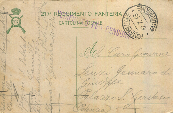 Cartolina in franchigia reggimentale del 217° Reggimento Fanteria |