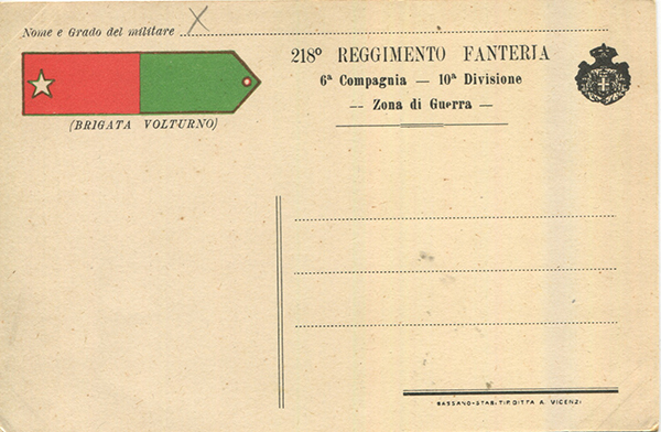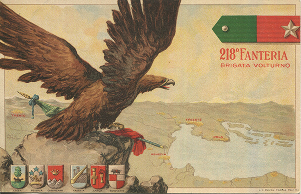 | Cartolina reggimentale del 218° Reggimento Fanteria edita nel 1918 |