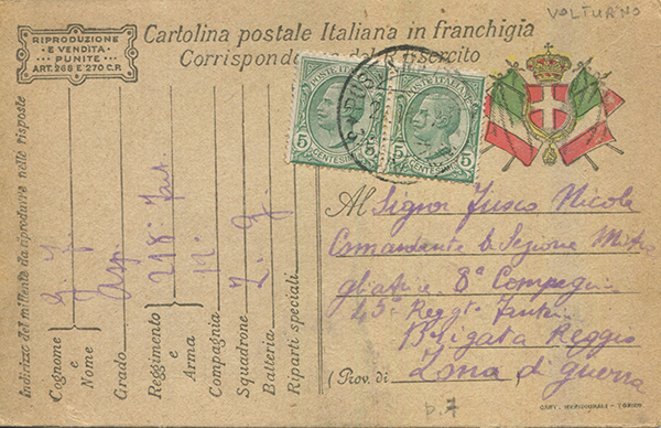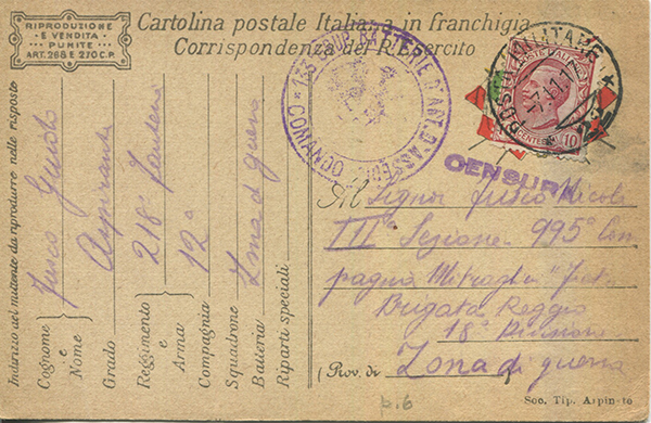 | Cartolina in franchigia affrancata per 10 cent in quanto indirizzata al fronte, inoltrata dall’ufficio di Posta Militare n. 32^ Divisione in data 27.11.17. Il mittente è un aspirante ufficiale del 218° Reggimento Fanteria |