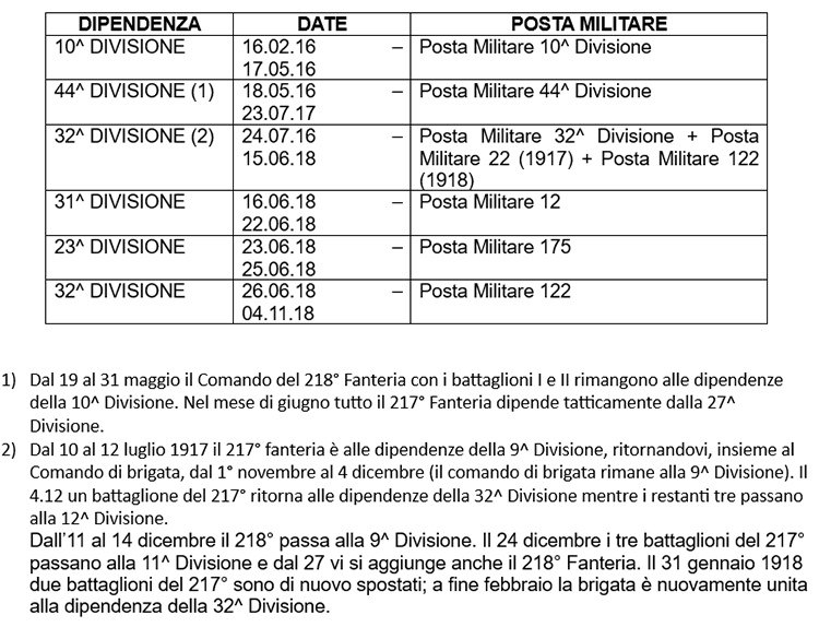 il Comando di Brigata ed il 217° dal deposito del 29° Fanteria; il 218° dal deposito del 15° Fanteria. I due Reggimenti erano stati formati fin dai primi di dicembre del 1915.