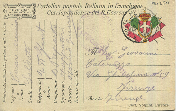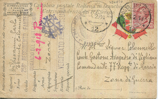 Cartolina in franchigia affrancata per 10 cent Leoni in quanto indirizzata al fronte, inoltrata dall’ufficio di Posta Militare n. 12 in data 4.2.18. Il mittente è il Ten. Col. Carlo di Giovanni, comandante del I battaglione del 256° Reggimento di Fanteria dal 28.11.17 al 18.2.18.