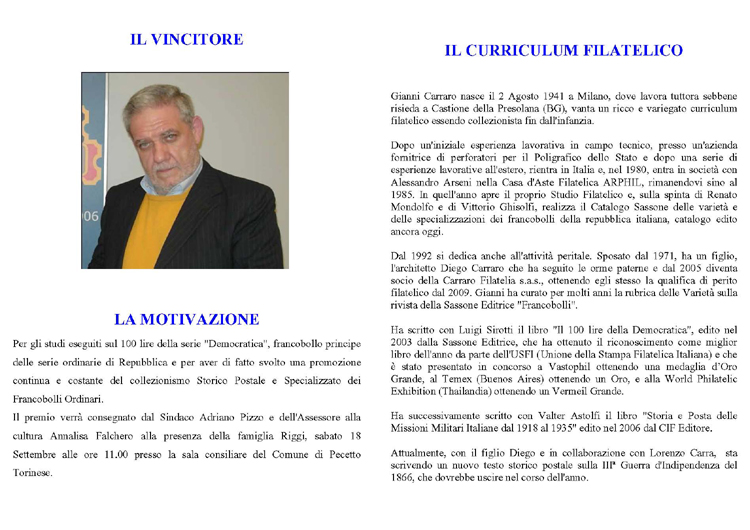 Torinese per la consegna a Gianni Carraro del premio Filatelico 2010