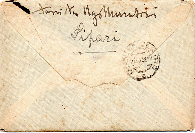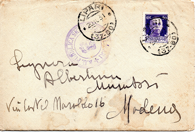20/10/1931 lettera dalla colonia di confino di Lipari per Modena affrancata per 50 cent. Il mittente è Ugo Muratori confinato antifascista politico, di professione commerciante. Bollo di censura R.U. PUBBLICA SICUREZZA DI LIPARI. Dal 1941 al 1943 l’isola di Lipari venne utilizzata dal regime fascista per l’internamento di ebrei Italiani e stranieri. Il Campo d’internamento venne chiuso con l’arrivo degli Alleati e lo sbarco in Sicilia e numerose famiglie vennero trasferite in altri campi di concentramento nell’Italia Centro Settentrionale e successivamente nei lager tedeschi. Con l’inizio dell’occupazione militare alleata, la prima questione a cui gli angloamericani dovettero far fronte riguardava la gestione dei territori occupati. Per questa ragione, tra il 9 e il 10 luglio del 1943, cominciò ad operare il Governo Militare Alleato (AMGOT), con a capo il generale inglese Harold Rupert Alexander. Tra le problematiche principali da affrontare vi era la crisi dei profughi, tra cui vi erano migliaia di ebrei. Di nuovo l’isola di Lipari venne designata per ospitare un campo di internamento. Finito il secondo conflitto mondiale dopo solo qualche mese di relativa tranquillità, ancora una volta Lipari viene individuata quale Centro Raccolta Profughi dal governo della neonata repubblica. Riattivato il campo, nel 1946, Lipari ospitò gruppi di ebrei stranieri classificati come “Indesiderabili”. Il 14 dicembre 1946, un primo gruppo di dieci ebrei venne inviato a Lipari. Le testimonianze raccolte evidenziano che le condizioni di vita erano molto dure non solo per la rigida disciplina interna ma anche per le ristrettezze economiche e per i problematici rapporti di convivenza tra gli internati. L‘isolamento geografico non contribuiva a migliorare la situazione. Le proteste erano all’ordine del giorno. La disperazione per la mancata libertà, il senso di abbandono e la difficoltà a reperire alimentavano le contestazioni di quanti erano trattenuti senza aver commesso reati. Tra gli internati c’erano anche dei ragazzi minorenni che erano fuggiti dalla Polonia e diretti in Palestina. Per gli ebrei detenuti a Lipari ci volle almeno un anno per ottenere la liberazione anche a causa della lunghezza della burocrazia nonché della difficoltà di comunicazione tra il Ministero dell’Interno e la Questura di Messina derivante, anche, dalla circostanza che Lipari si trovasse in una posizione di obiettivo isolamento. Ma per Lipari non era ancora finita. Dopo la fine della guerra erano circa 40 milioni le persone che erano state deportate e allontanate dalla propria terra. Che non potevano o non volevano ritornarci. L’Italia, fin dai tempi antichi ponte e crocevia tra Oriente e Occidente, si trovò tra i paesi maggiormente interessati da questa ulteriore emergenza umanitaria. Migliaia e migliaia di profughi, displaced persons, dovettero essere assistite sia dalle autorità italiane che alleate. Tra loro molti definiti “indesiderabili” perché avevano commesso reati, oppure compromessi con i passati regimi, o perché entrati clandestinamente. Anche tante donne sbandate o ex prostitute che avevano accompagnato le truppe alleate nei vari luoghi del conflitto. Ed infine sud tirolesi che si erano arruolati con l’esercito germanico quando l’intera zona era sta annessa al Terzo Riech per venti mesi. Anche a Lipari venne aperto un Centro Raccolta Profughi presumibilmente operante fino al 1959.