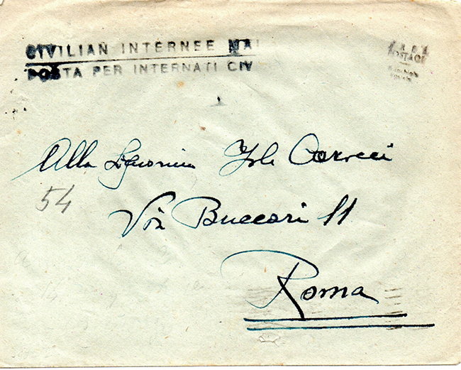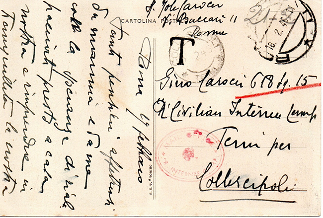 16/2/1946 Cartolina da Roma per il campo di Collescipoli in franchigia postale con errata applicazione del timbro T di tassata. In rosso il timbro del campo, in forma ovale, portante la dicitura “Mail Office + “R” Internee Camp”.