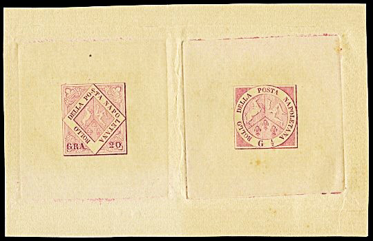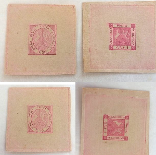 le foto che ha inviato sono sicuramente due delle ristampe private effettuate nel 1898 dalle matrici che servivano a preparare le tavole dei francobolli di Napoli. Sono stampate su foglietti di carta a mano consistente e non filigranata. Sul catalogo sono classificati ai numeri da R1 a R6 e valutati 375 euro cd.