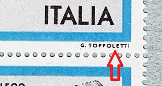 ormai e come al solito, con la lente sempre in mano, mi trova micrometrici difetti di stampa che non abbiamo mai visto. Talvolta sono riporti talvolta no. Ho controllato solo due fogli interi ed il microscopico puntino o “accento in Toffol’etti” è saltato fuori sul terzo francobollo Siai 260 Turbo della colonna di destra o meglio sul 20° esemplare del foglio. Puntini come quello però sui fogli ce ne sono altri, ma dato che ne ha già rintracciati diversi, è probabile che si tratti di una piccola varietà di riporto, da confermare. Comunque un controllo su altri fogli è da farsi, non vorrei che fosse solo un difetto occasionale poi tolto dal macchinista.