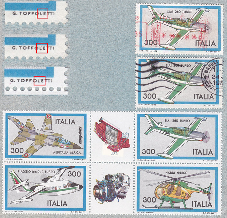 In allegato la scansione dei francobolli di cui in oggetto dove, su quello di SIAI 260 TURBO nella scritta in ditta, dove è riportato il nominativo G. TOFFOLETTI, c'è la varietà di riporto (?) evidenziata: apostrofo tra le lettere L e E presente solo su tutti i francobolli trovati dello stesso esemplare.