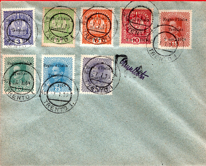 Ciao Roberto, sono Artemide Pozza del Circolo Filatelico di Aosta. Sono venuto in possesso di questa busta con francobolli d'Austria sovrastampati "Regno d'Italia Trentino” del 1918. La busta non è viaggiata e la serie non completa. Ti ringrazio anticipatamente