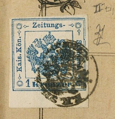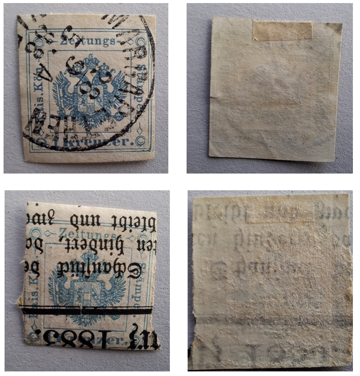 i francobolli inviati in foto, (di cui uno molto difettoso), sono segnatasse per giornali dell’Impero Austriaco da 1 Kreuzer azzurro del 3° tipo, emessi nel 1858/79 e gli annulli sembrerebbero originali, uno normale ed uno tramite stampa tipografica, in quanto per un certo periodo i francobolli venivano applicati sul giornale prima della stampa, poi tale metodo fu abolito. Di questo francobollo esistono tre diversi tipi di stampa che si riconoscono dalla bandierina o nastro sul becco dell’aquila: 1° tipo chiusa, 2° tipo aperta e ben visibile (quella più rara, specialmente su giornale) e 3° tipo sottile, la più comune.