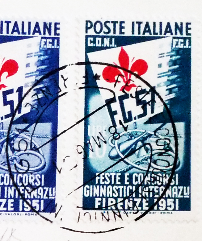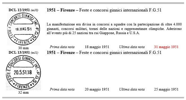 Egr. Dr. Moscadelli, come leggo in una Sua risposta nella rubrica del Postalista “Varietà nei francobolli del Regno e della Repubblica”, Gian Franco Mazzucco illustra le impronte e le date conosciute dei due annulli utilizzati durante la manifestazione “Giochi Ginnici di Firenze” svoltisi dal 20 Maggio al 2 Giugno 1951 (la serie è stata emessa due giorni prima: il 18 Maggio). Il sig. Mazzucco indica una prima impronta, diametro 30mm, recante date da 18 Maggio a 31 Maggio e una seconda di diametro maggiore (32mm), indicando come prima data nota 20 Maggio