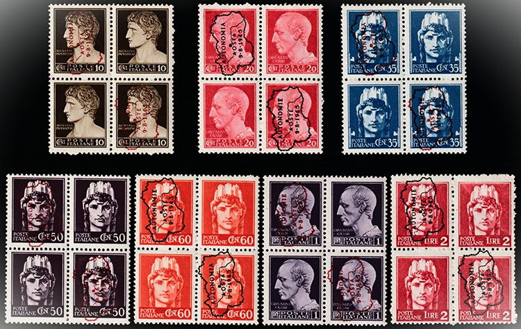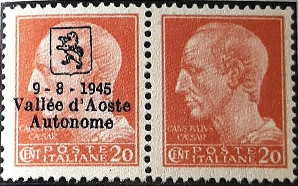 Quelli con lo stemmino e il leone sono soprastampati tipograficamente su valori della serie Imperiale, in italiano ed in francese alternati, “Valle d’Aosta Autonoma 9-8-1945” e gli altri con la cartina della Valle d’Aosta, che sono stati emessi anch’essi a favore dell’autonomia Valdostana, hanno soprastampa tipografica in francese ed italiano “Autonomia Aosta 9-8-1945” su francobolli della serie Imperiale (emissione di Novara II).