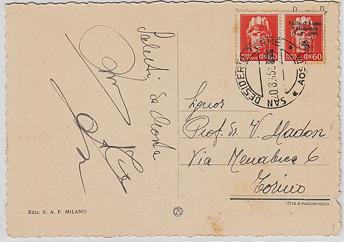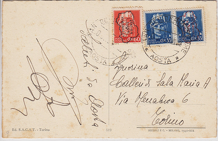 ho visto le belle cartoline inviate in foto ed affrancate con valori cosiddetti “dopo liberazione” emessi in autonomia dal C.L.N. di Aosta.